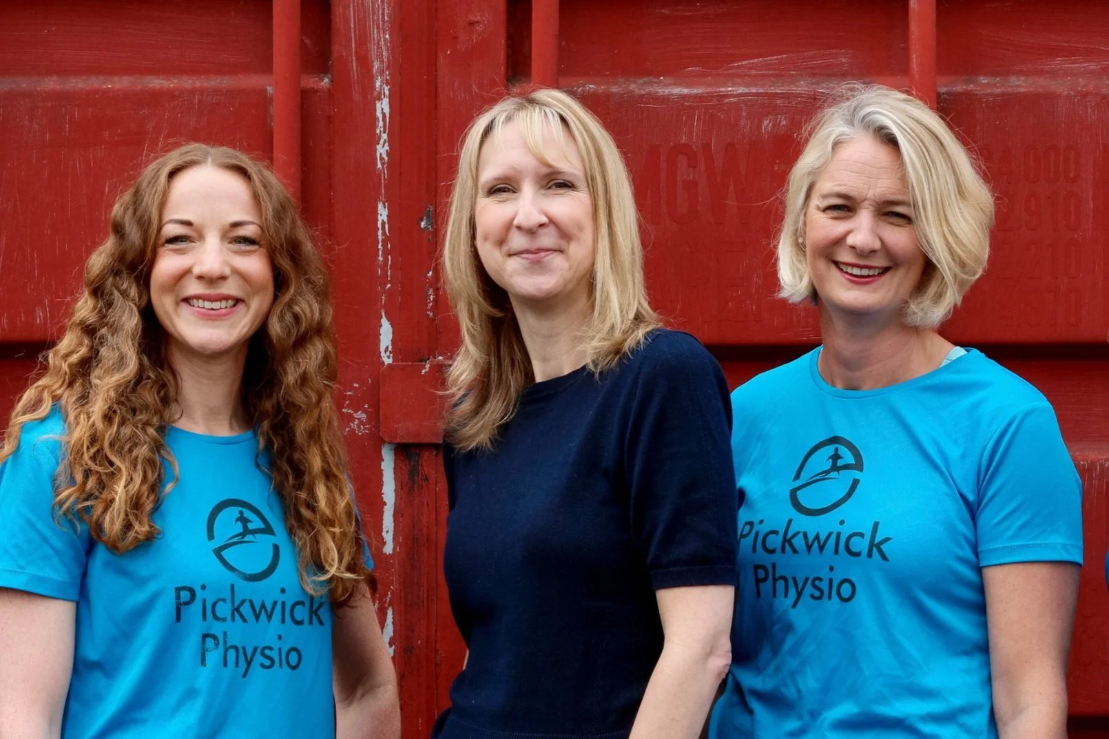 Three smiling women standing in front of a red wooden wall, two wearing blue "Pickwick Physio" T-shirts and one in a dark blue top.